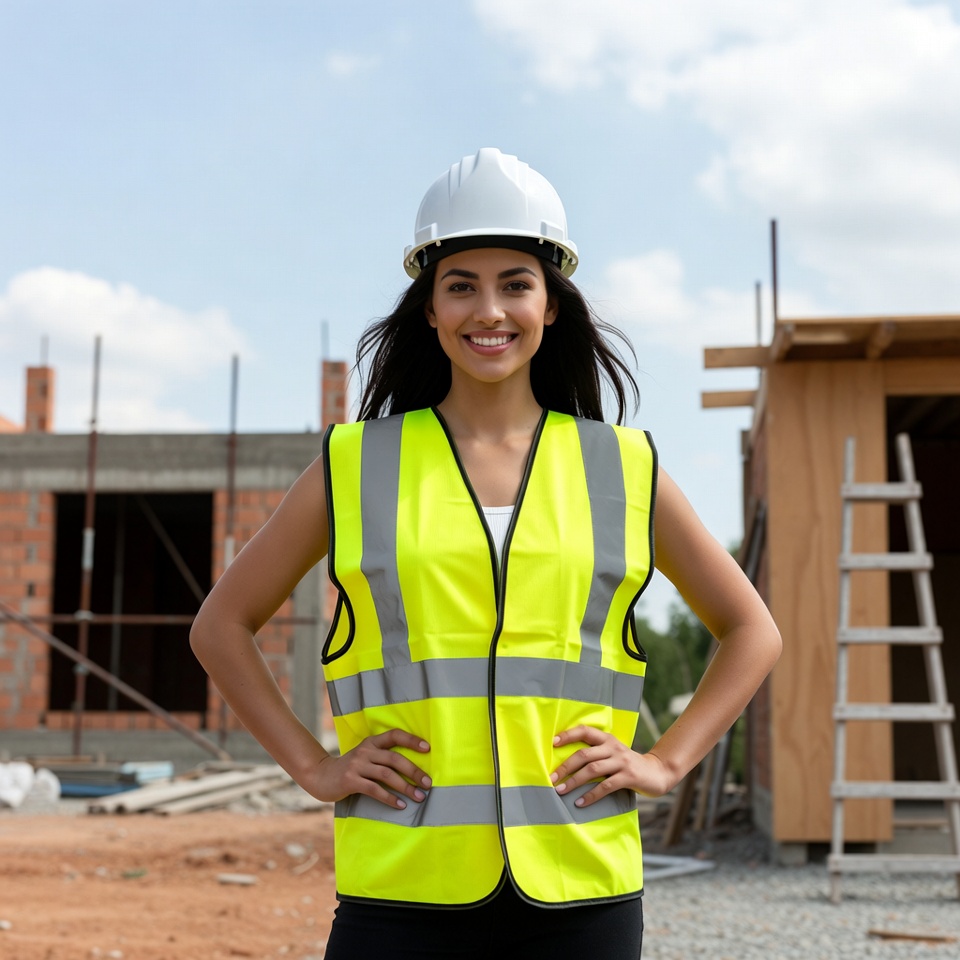 Woman wearing a safety vest and hard hat stands confidently at a construction site with building materials in the background.