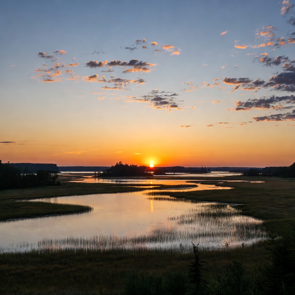 The sun sets behind a distant island, reflecting on smooth waters and illuminating the marsh grass along the shore at twilight.