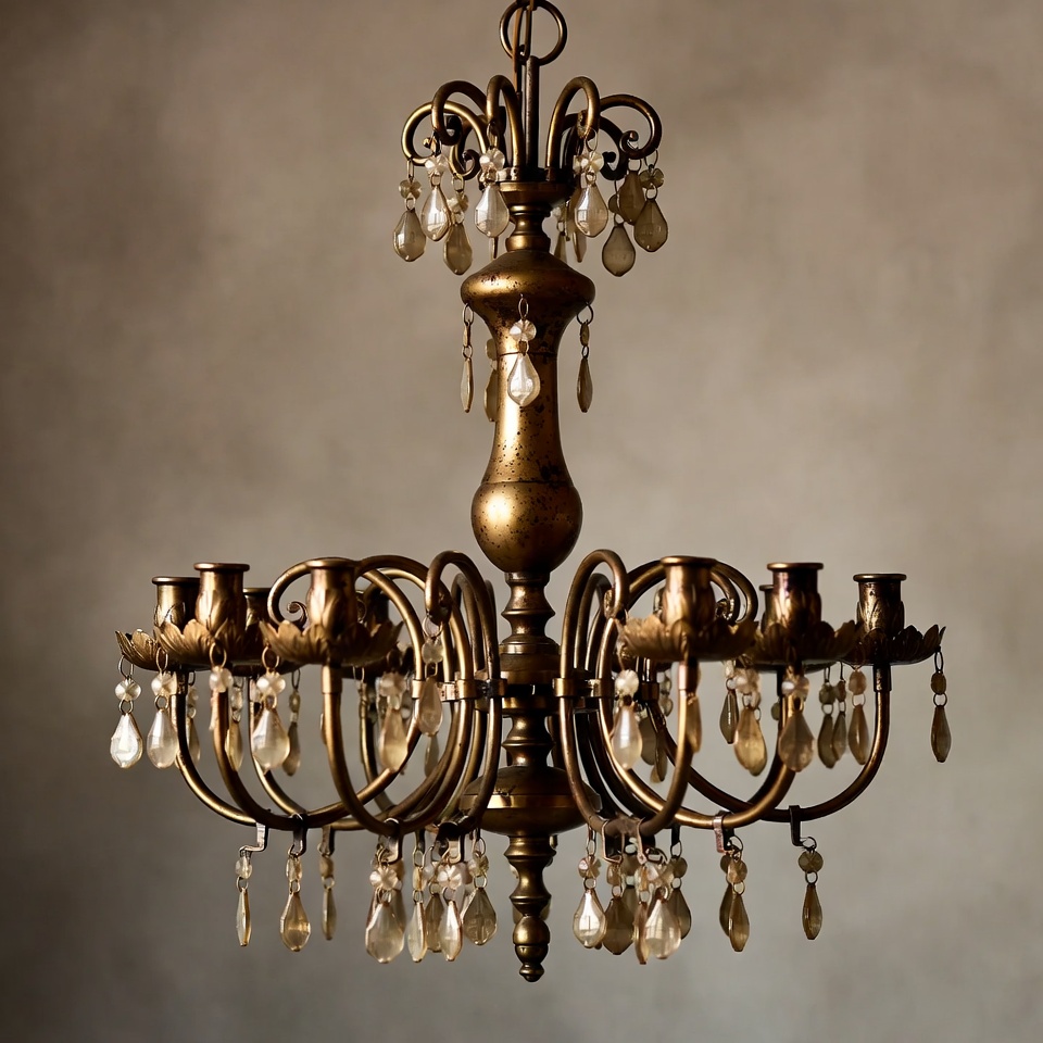A vintage chandelier with metal arms and crystal drops hangs from the ceiling, reflecting light in a dim room.