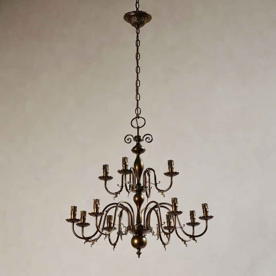 A chandelier with many arms hangs from the ceiling. It has multiple lights ready to be lit, illuminating the space below.