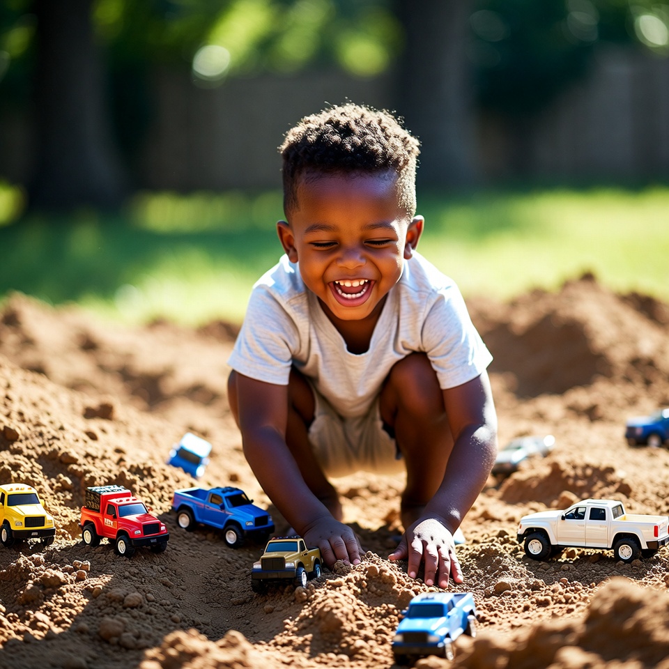 A young boy laughs while playing in a dirt area with several toy trucks around him. It is a sunny day in a backyard.