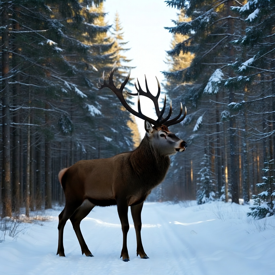 animal, antlers, branches, cold, deer, environment, fauna, forest path, landscape, light, nature, outdoors, seasonal, shadow, snowy forest, sun, tall trees, tranquility, wildlife, winter scene