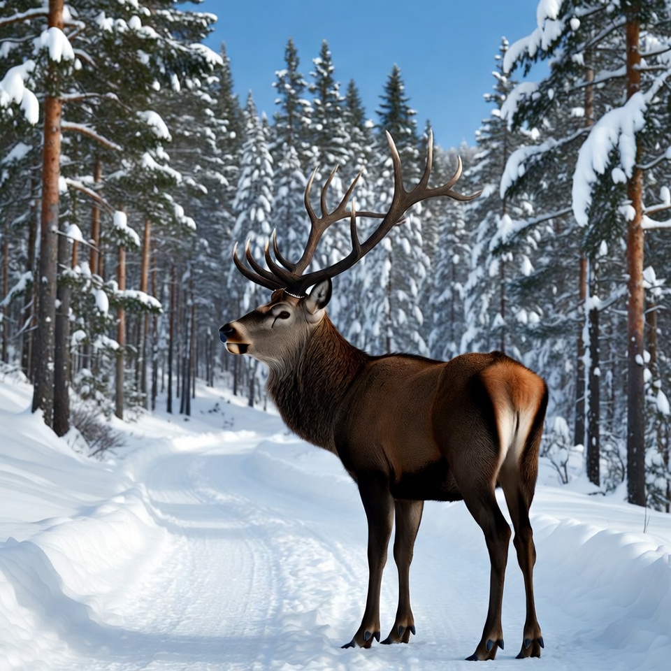 A deer is seen on a snowy path surrounded by tall trees in a winter forest. The animal looks alert against the white snow.