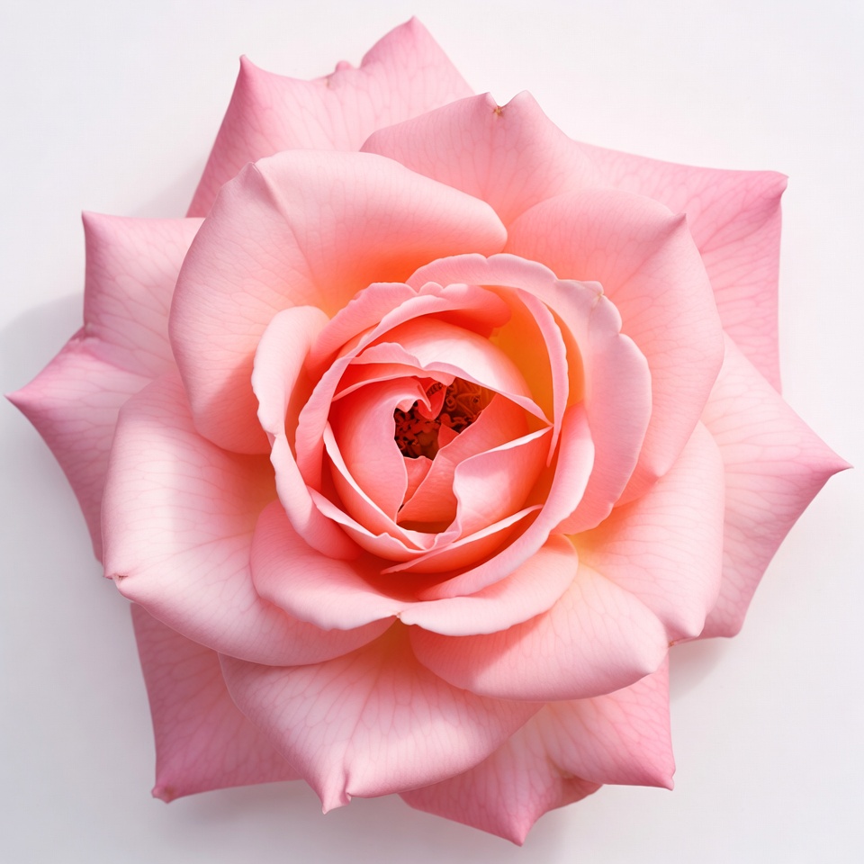 A pink rose sits on a white surface, showcasing its petals and intricate center. The flower appears fresh and vibrant in this close shot.