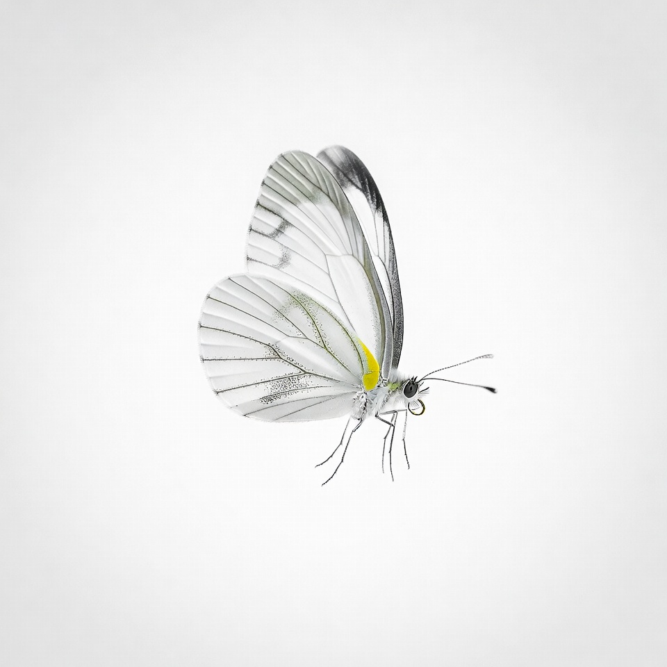 A butterfly with delicate wings flies against a light background, displaying intricate patterns and details of its body and wings.