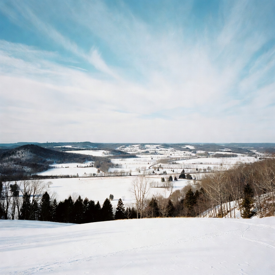 Snow covers the ground as a wide view of fields and hills shows winter's impact. Trees stand bare against a bright sky.