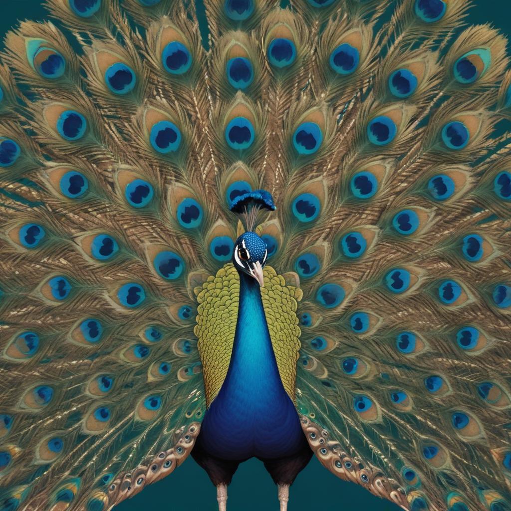 A peacock stands proudly, showing its colorful feathers in a beautiful display. The feathers have vivid blue and green patterns.
