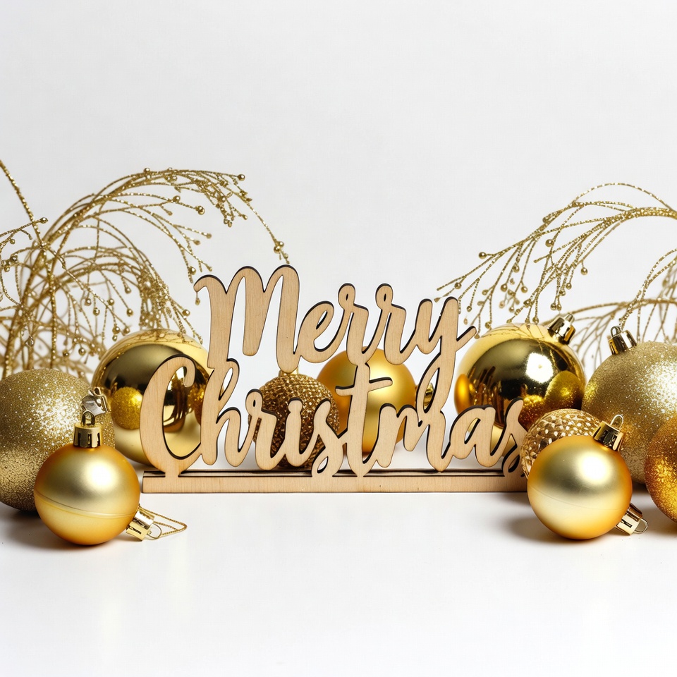 Golden Christmas ornaments and a wooden sign with Merry Christmas are arranged together on a plain background for holiday decoration.