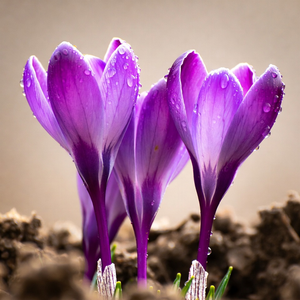beauty, blooms, blossom, crocus, droplets, floral, flowers, garden, growth, landscape, nature, outdoor, petals, plants, purple, rain, soil, spring, sunlight, watering