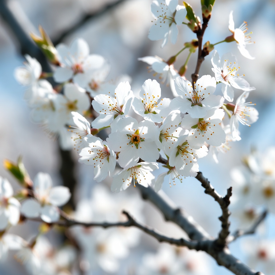 White flowers are seen growing on a tree branch against a bright blue sky during spring. The petals are open and fresh.