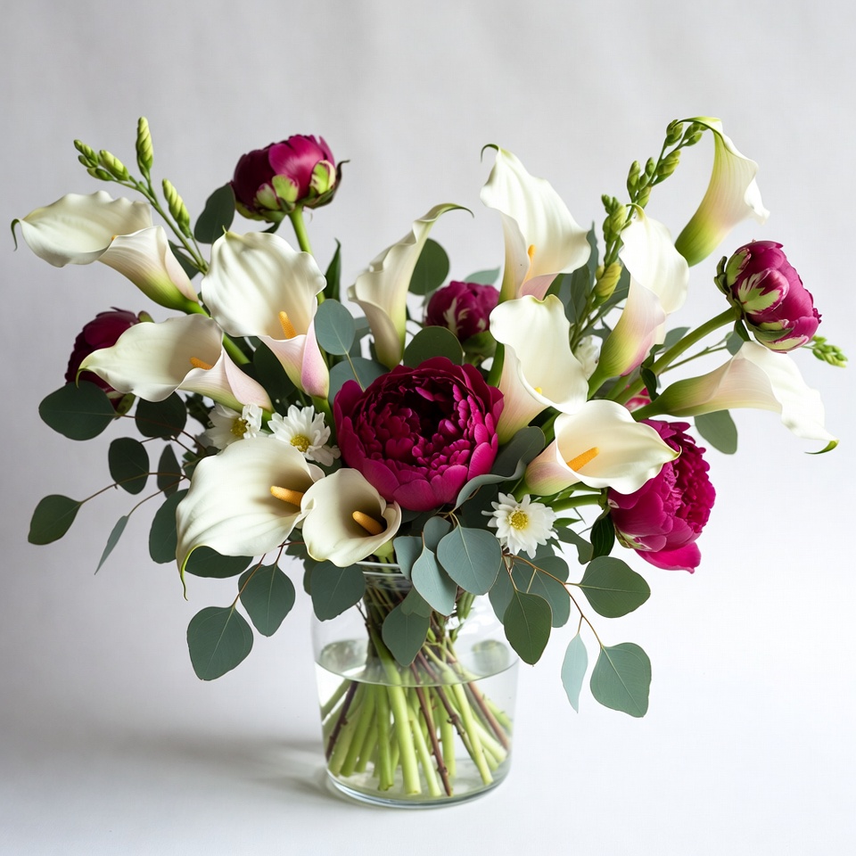 bouquet, centerpiece, colorful, daisy, decoration, event decor, floral arrangement, floral design, floristry, flowers, gift, greenery, home decor, indoor plants, lily, nature, peony, purple flowers, vase, white flowers