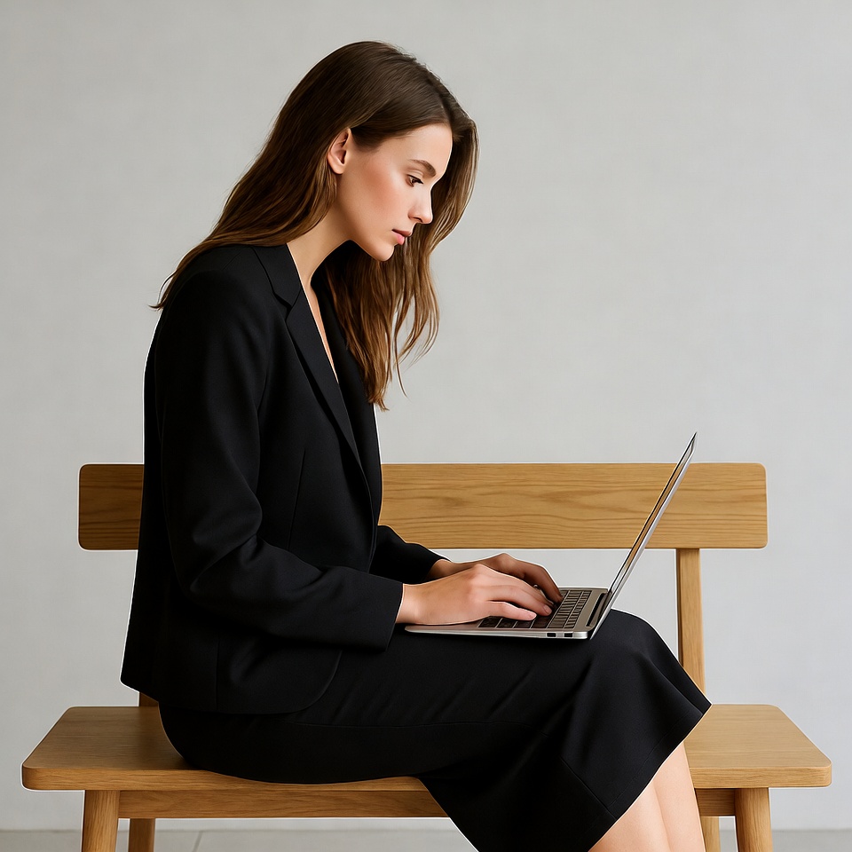 A woman with long hair sits on a bench typing on her laptop. She wears a black suit and is focused on her task in a simple indoor space.