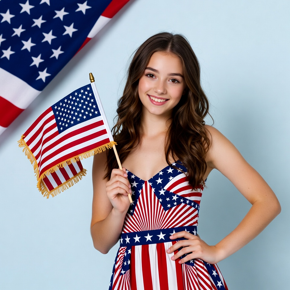 A girl smiles while holding a small flag. She wears a dress with a flag design. The background is light blue and features a larger flag.