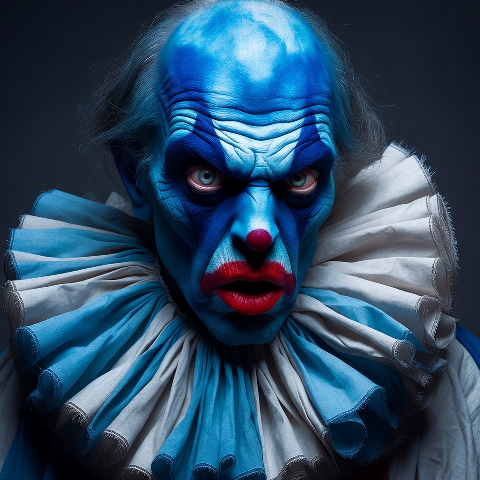 A clown with blue face paint poses dramatically. The clown wears a large ruffled collar and displays an intense gaze.