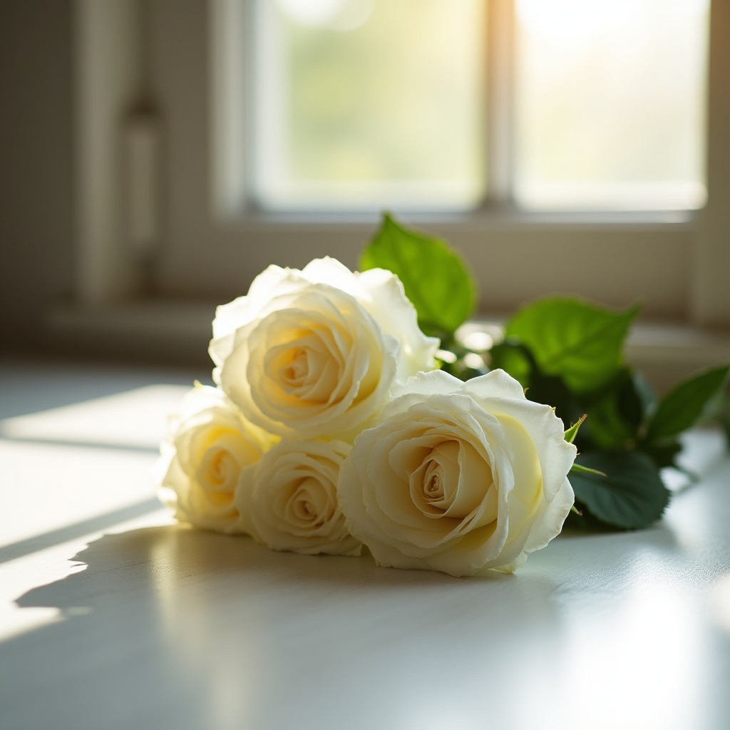 White roses are placed on a window sill with sunlight coming through. Green leaves surround the flowers, creating a soft glow around them.