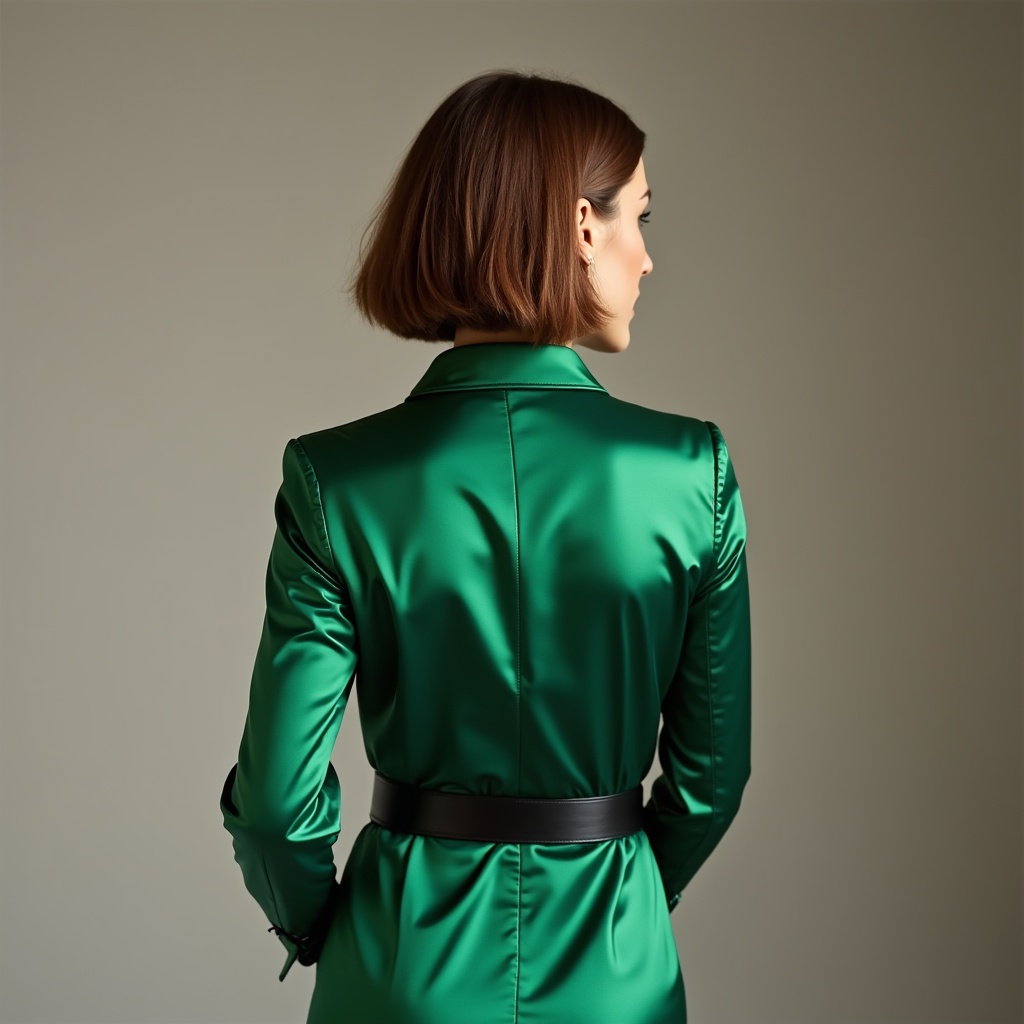 apparel, back view, belt, clothing, design, elegance, fabric, fashion, green, hair, hairstyle, model, neutral background, outfit, pose, shoot, short hair, studio, styling, trend