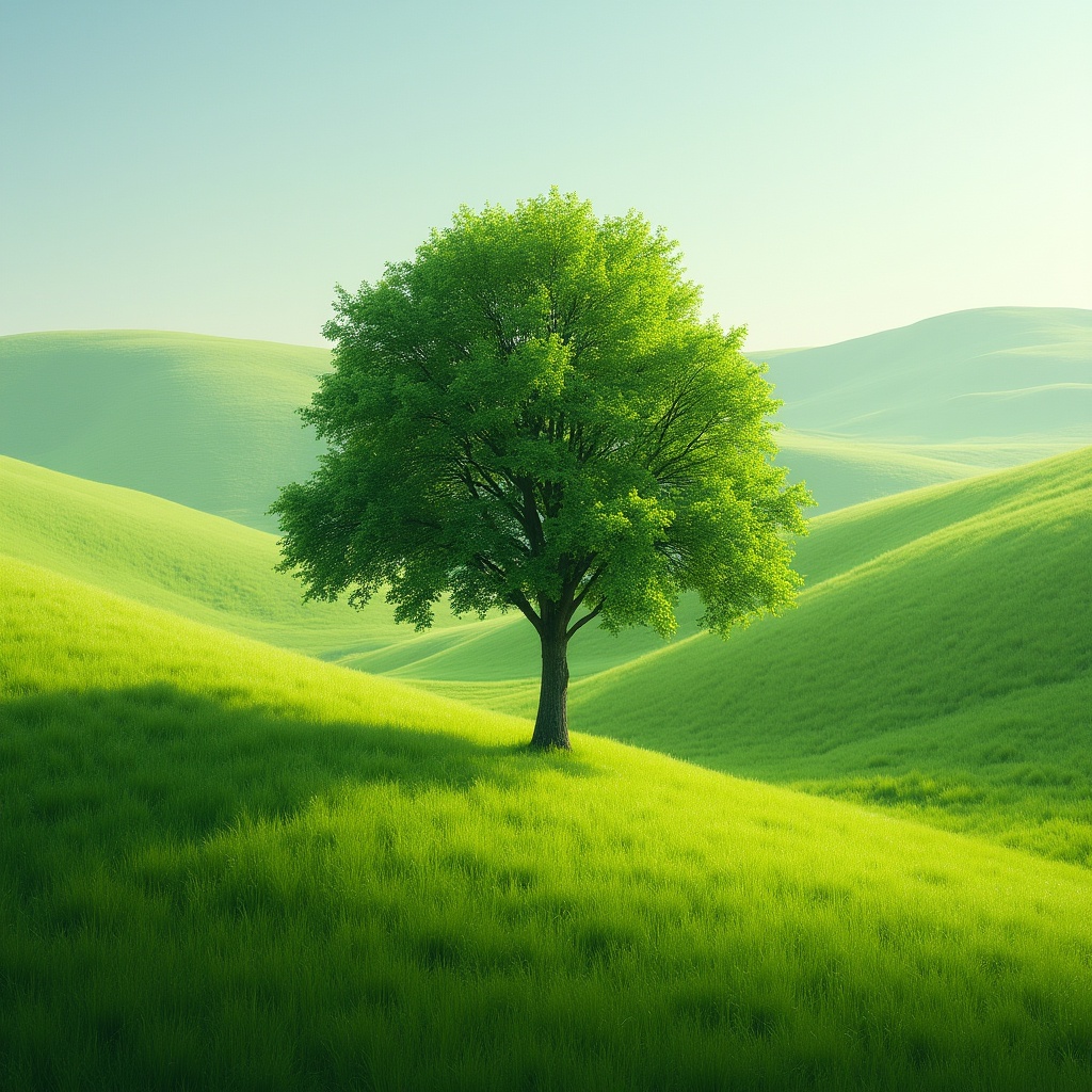 A single green tree stands on green hills during daylight. The scene shows smooth grass and gentle slopes in the background.
