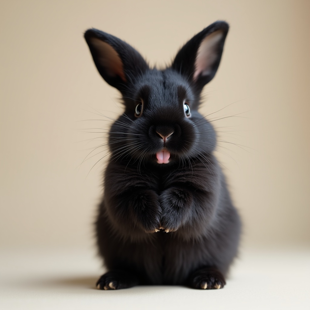 A black rabbit stands on a light surface with its paws together. It looks directly at the viewer, surrounded by a smooth background.
