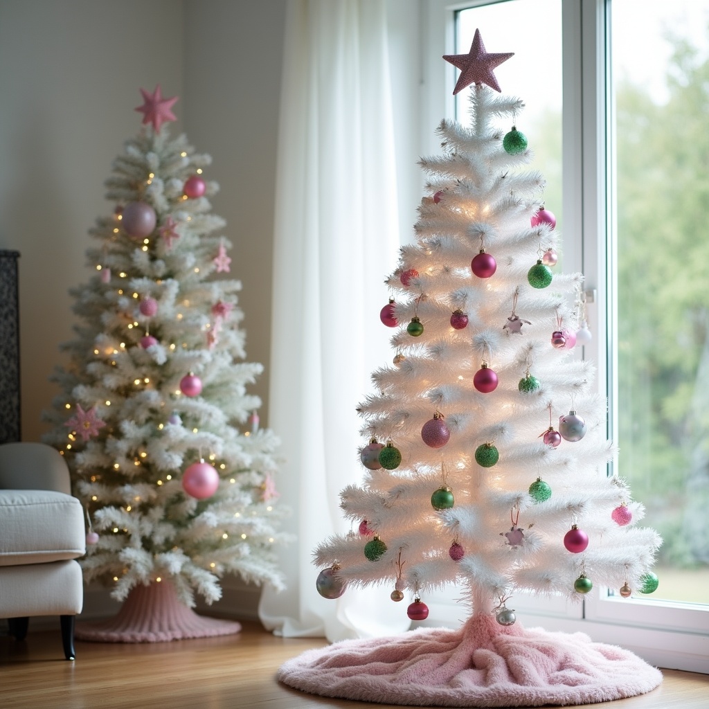 Two white Christmas trees stand in a living room. They are decorated with ornaments and lights, creating a holiday atmosphere.