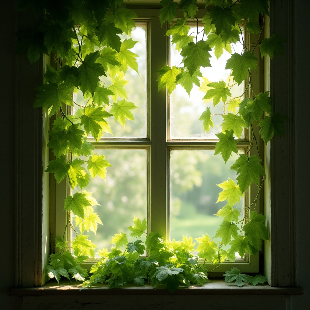 Bright green leaves grow around a window, letting in sunlight. The scene shows nature blending with indoor space in the daytime.