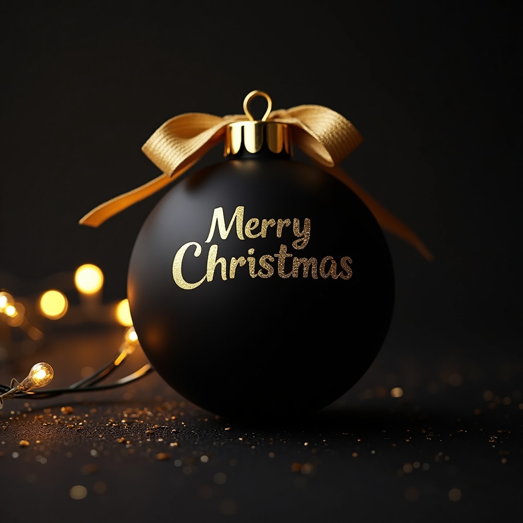 A black Christmas ornament hangs on a string. The ornament has golden text that says Merry Christmas and is surrounded by small lights.