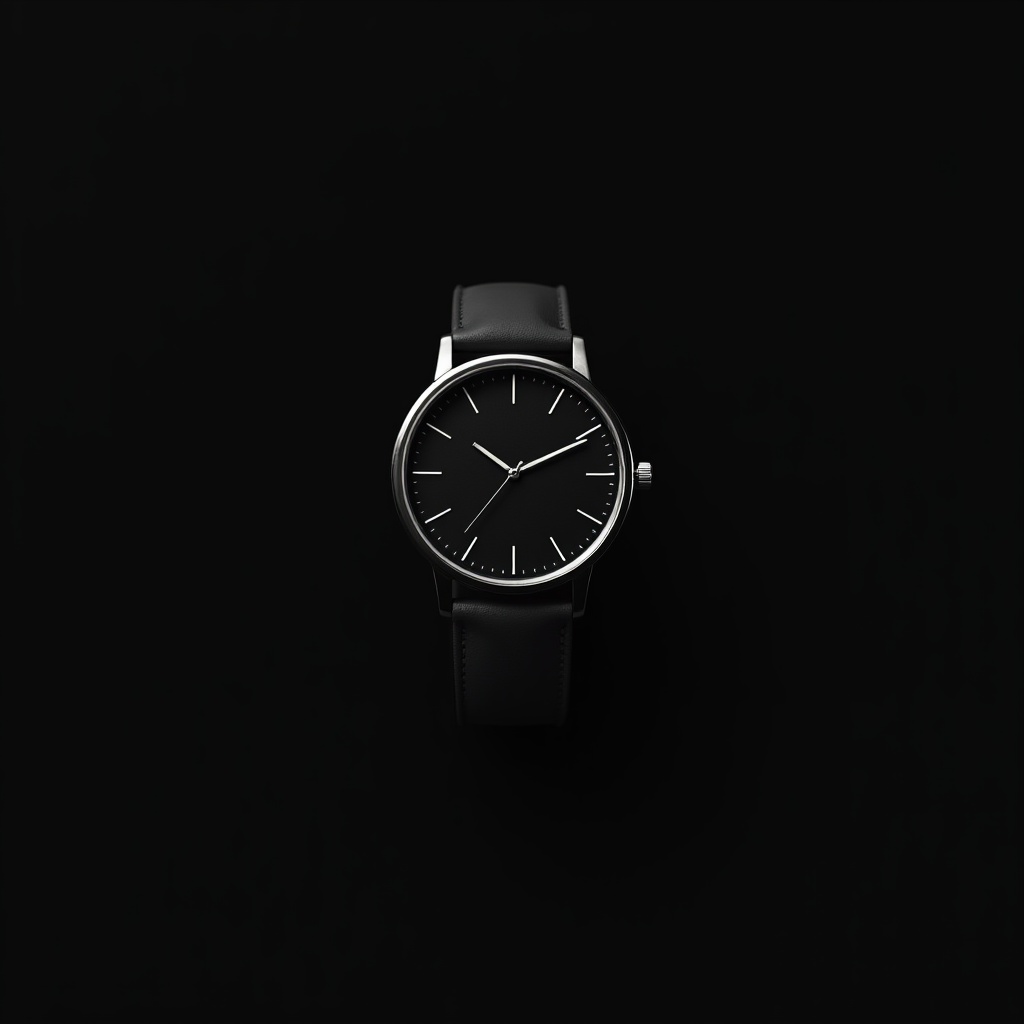 A black watch sits on a dark surface, displaying the time. The watch has a minimalist design with thin hands and markers.