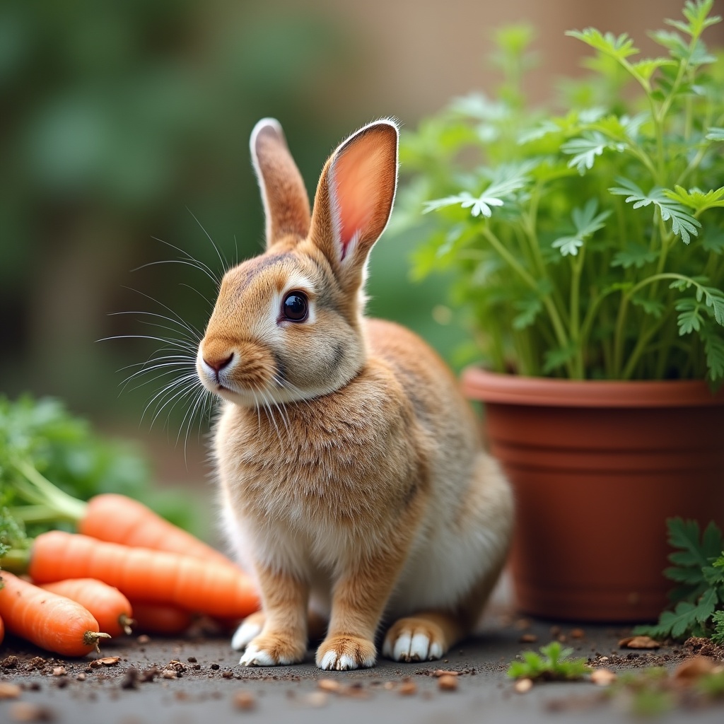 A rabbit sits near fresh carrots and a pot of herbs in a garden setting. The scene shows a natural environment during daylight.