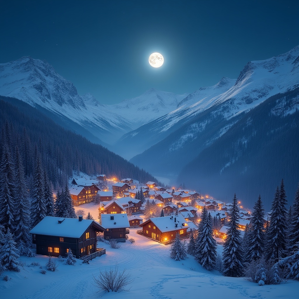 Snow covers the ground in a village. Lights from houses shine bright. Tall trees and mountains surround the area at night.