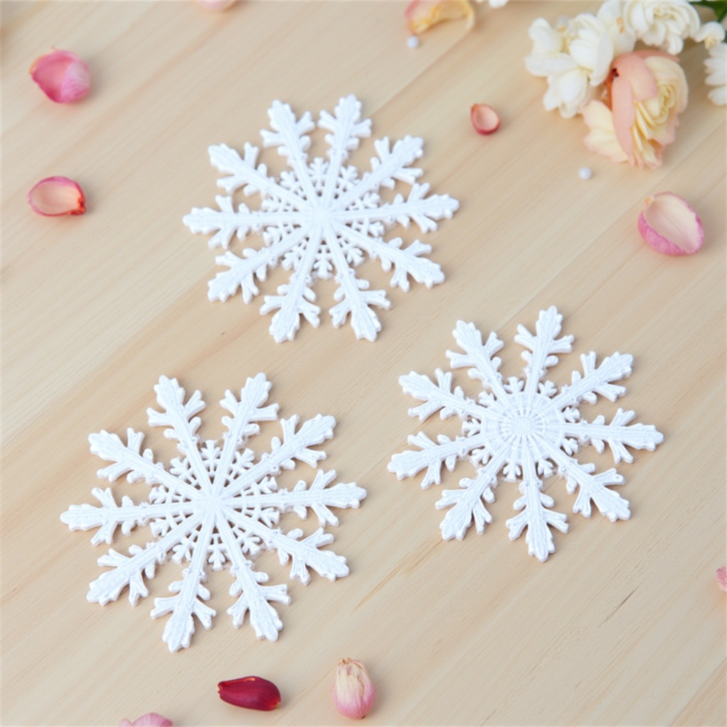 Three white snowflake decorations lie on a wooden surface surrounded by scattered rose petals. The scene captures winter decor ideas.