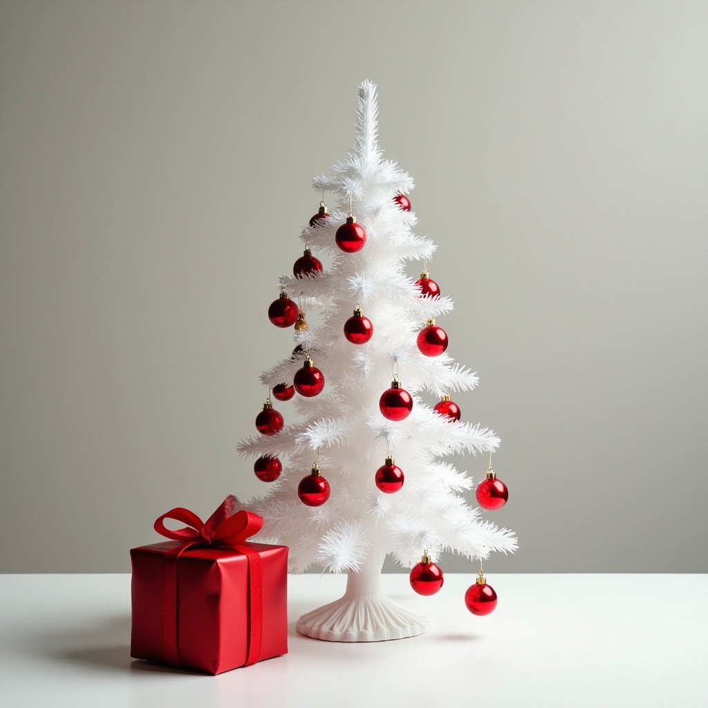 A small white Christmas tree stands on a table beside a wrapped present. The tree is decorated with shiny red ornaments.