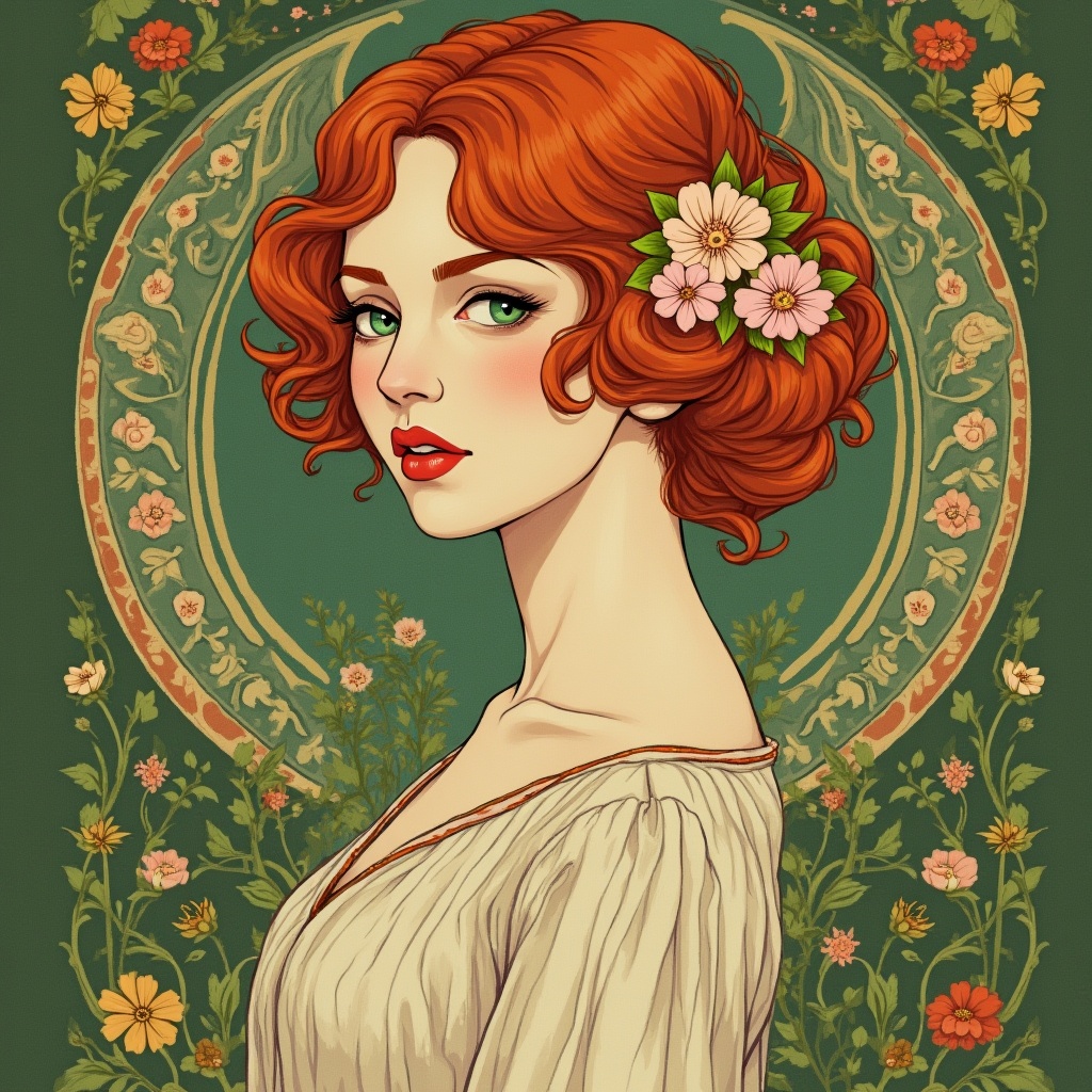 A woman with red hair stands in profile. She has flowers in her hair and a neutral expression. The background displays floral patterns.