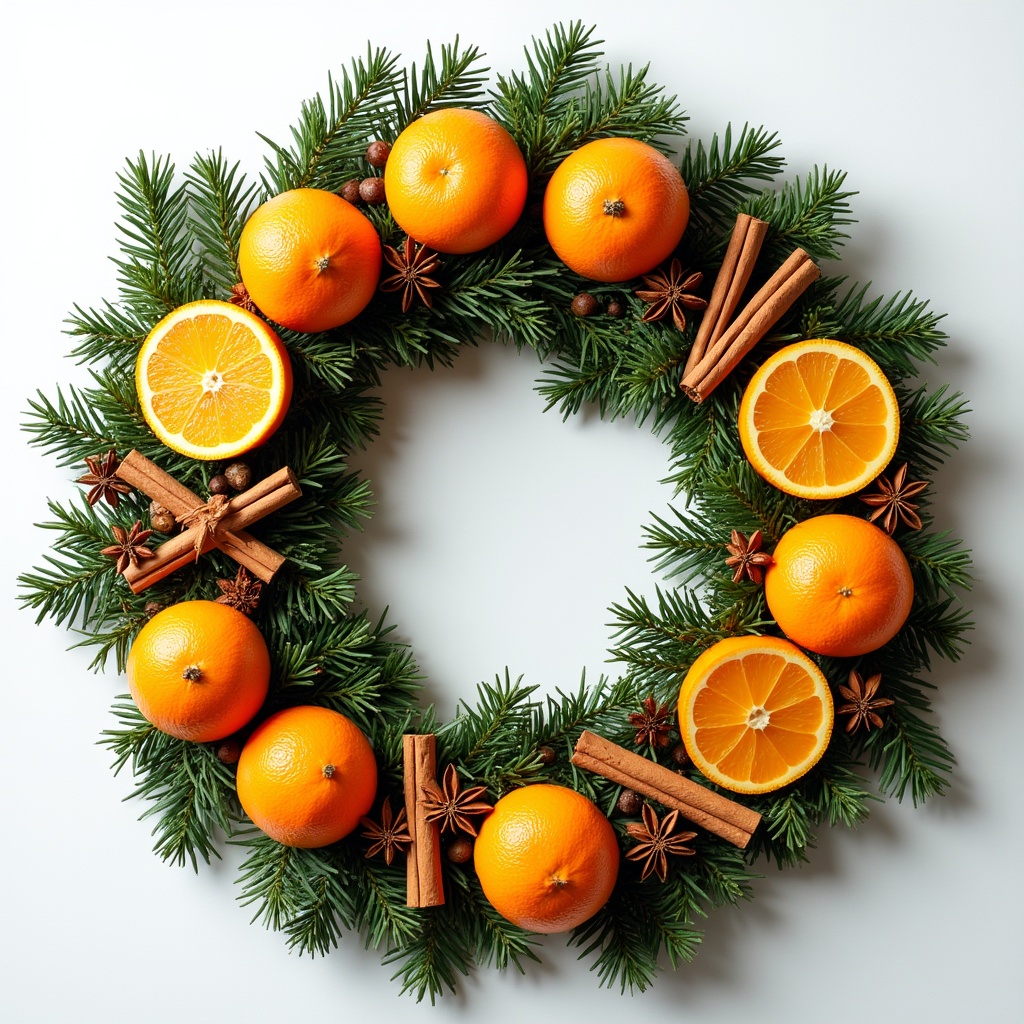 A holiday wreath made of pine branches, oranges, and cinnamon sticks placed on a plain background. This craft showcases festive decoration ideas.