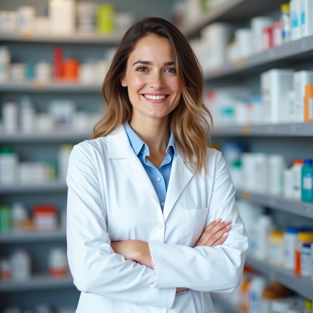 A pharmacist stands confidently in a drugstore with shelves full of medications and products. She is ready to assist customers.