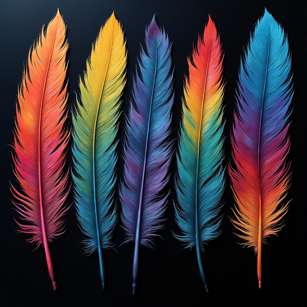 Five feathers are placed in a row, showing bright colors. Each feather has a unique shade and design, creating a vibrant display.