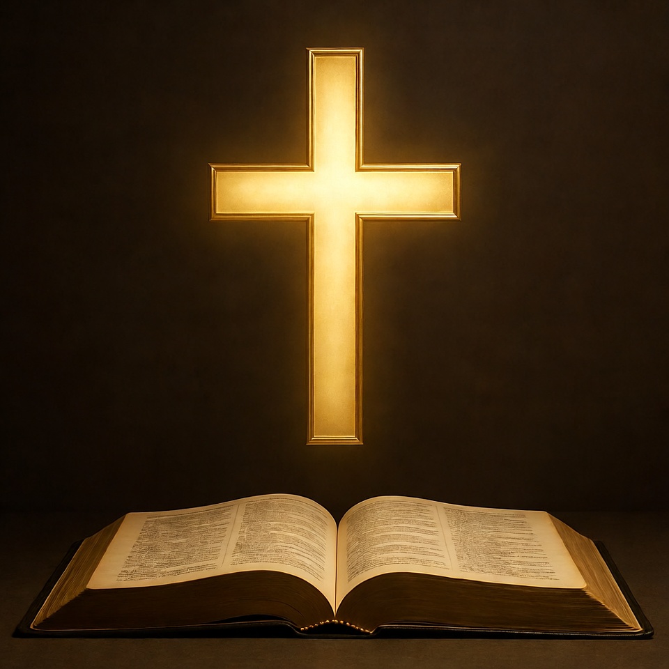 A large open book sits on a dark surface with a glowing cross floating above it. The scene suggests a religious theme.