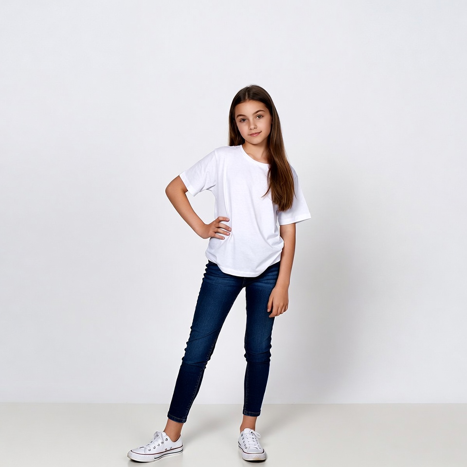 casual, child, children, denim, expression, fashion, girl, hairstyle, happiness, jeans, modern, outfit, playful, pose, smile, standing, studio, t-shirt, white, youth