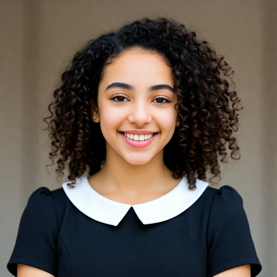 Young girl with curly hair smiles while wearing a black dress with a white collar. She stands in front of a light wall during daylight.
