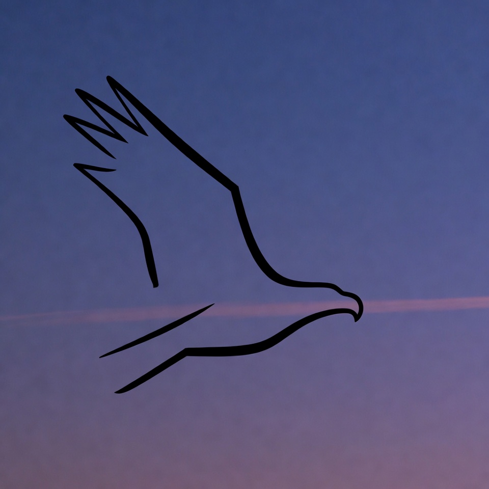A bird is flying against a sunset sky. The outline shows its wings spread wide. The background has soft colors as day turns to night.