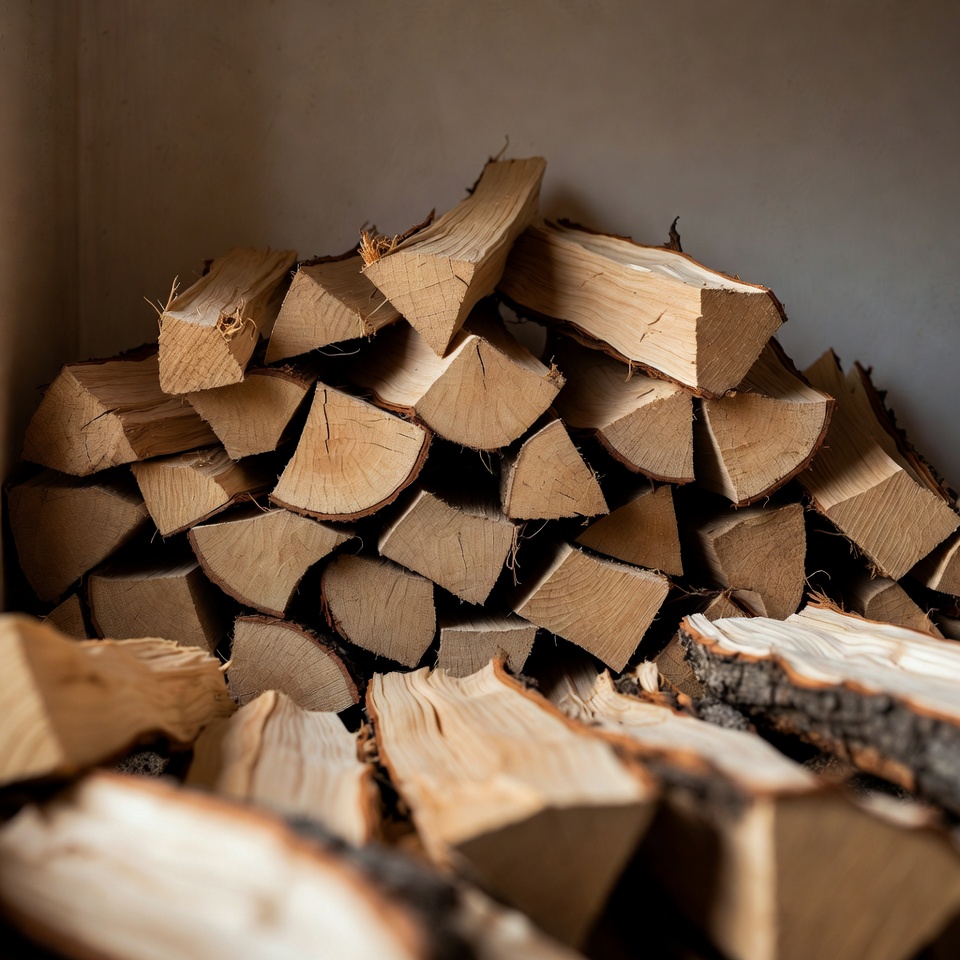Firewood is neatly stacked in a storage space ready for use. The logs show clean cuts at the ends, organized for easy access.