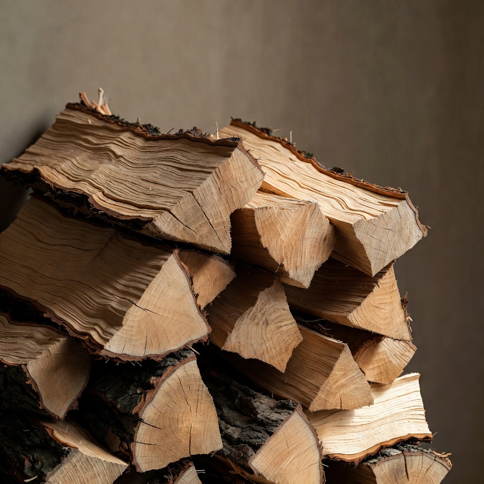 Cut firewood is neatly stacked against a wall. The wood shows natural textures and grains. Indoor lighting highlights the arrangement.
