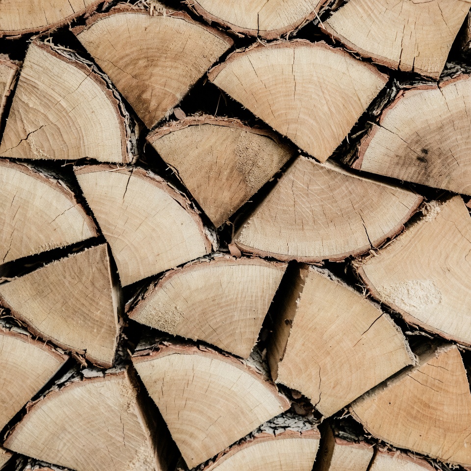 Wood pieces are stacked in a neat arrangement. The circular ends show tree rings, indicating their age and origin.