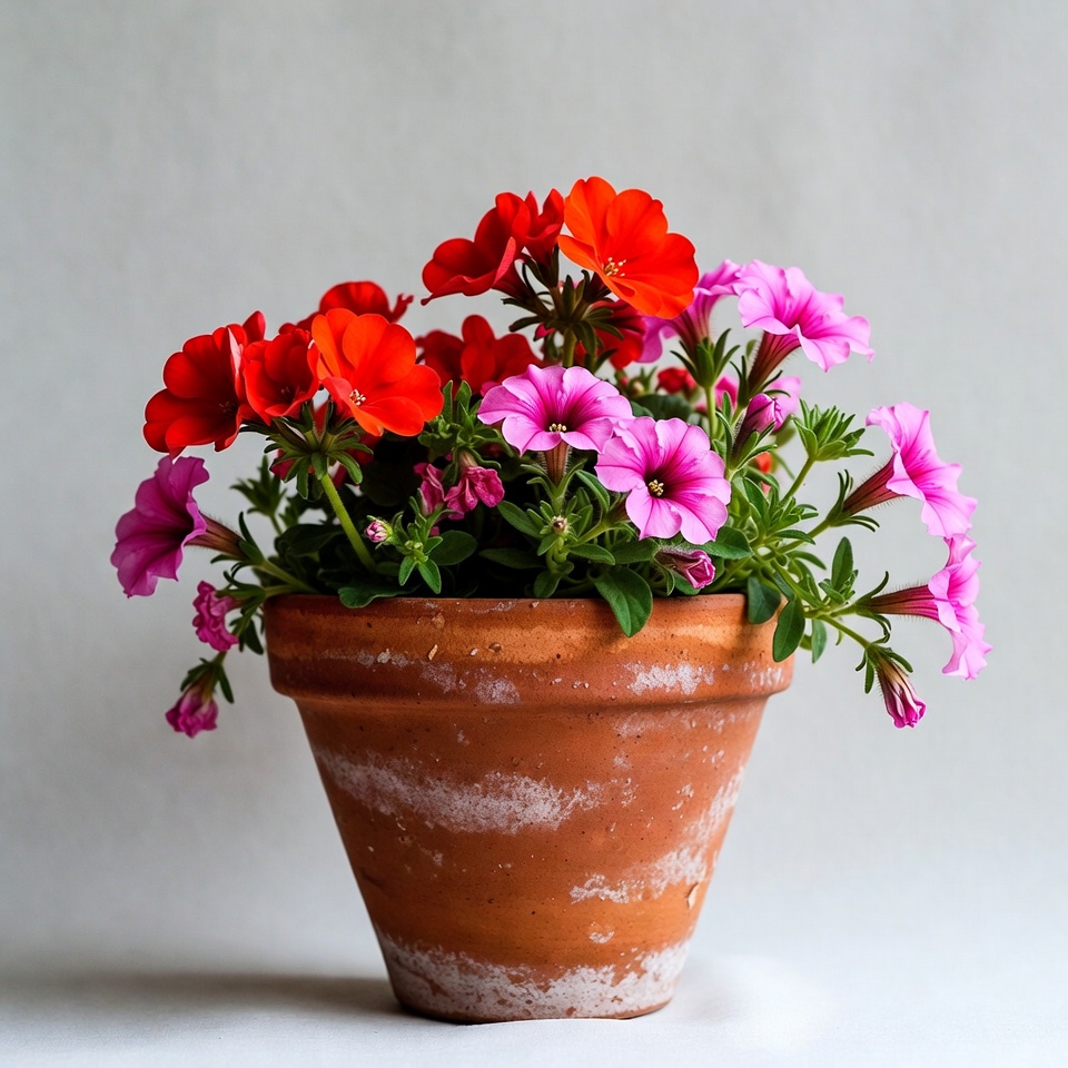 blooms, clay pot, color, decoration, floral arrangement, flowers, fresh flowers, gardening, geranium, home decor, horticulture, indoor plants, leaves, nature, petunia, pink flowers, plant, red flowers, spring, still life