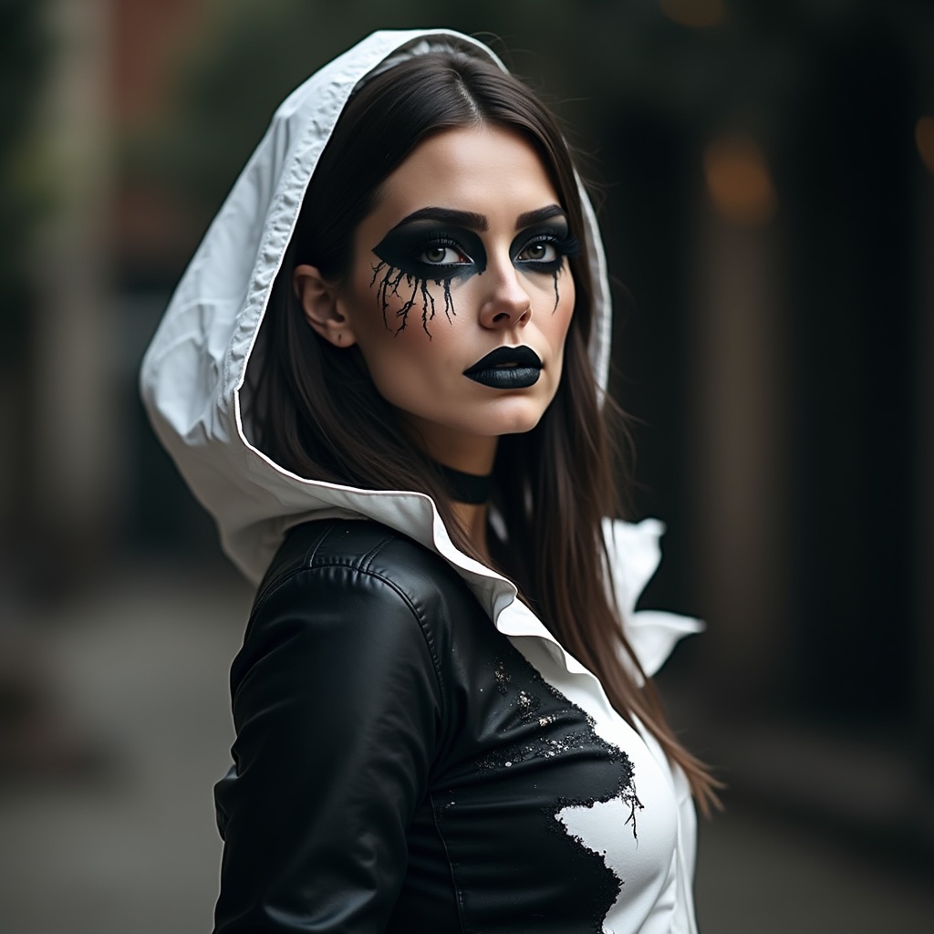 black, bold, city, expression, eyeliner, face paint, fashion, goth, hood, makeup, model, modern, outfit, portrait, pose, street, style, urban, white, woman