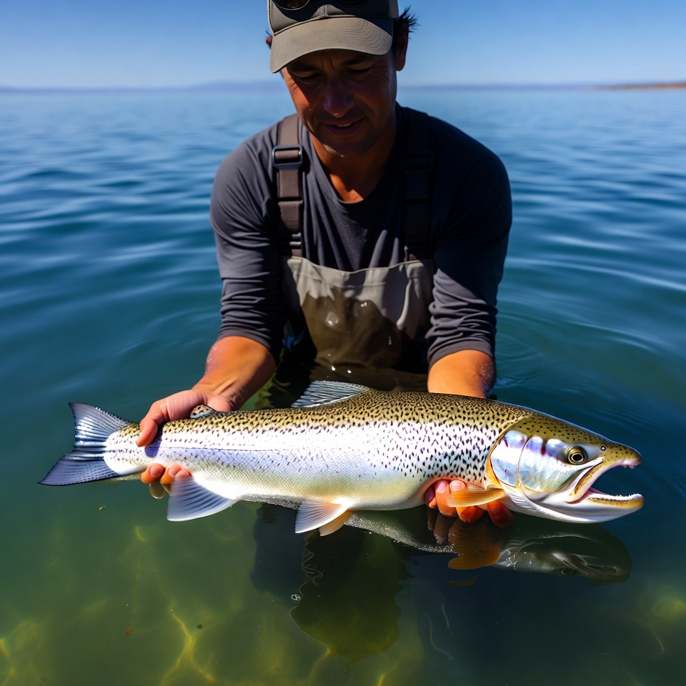 Fisherman holds large trout in water