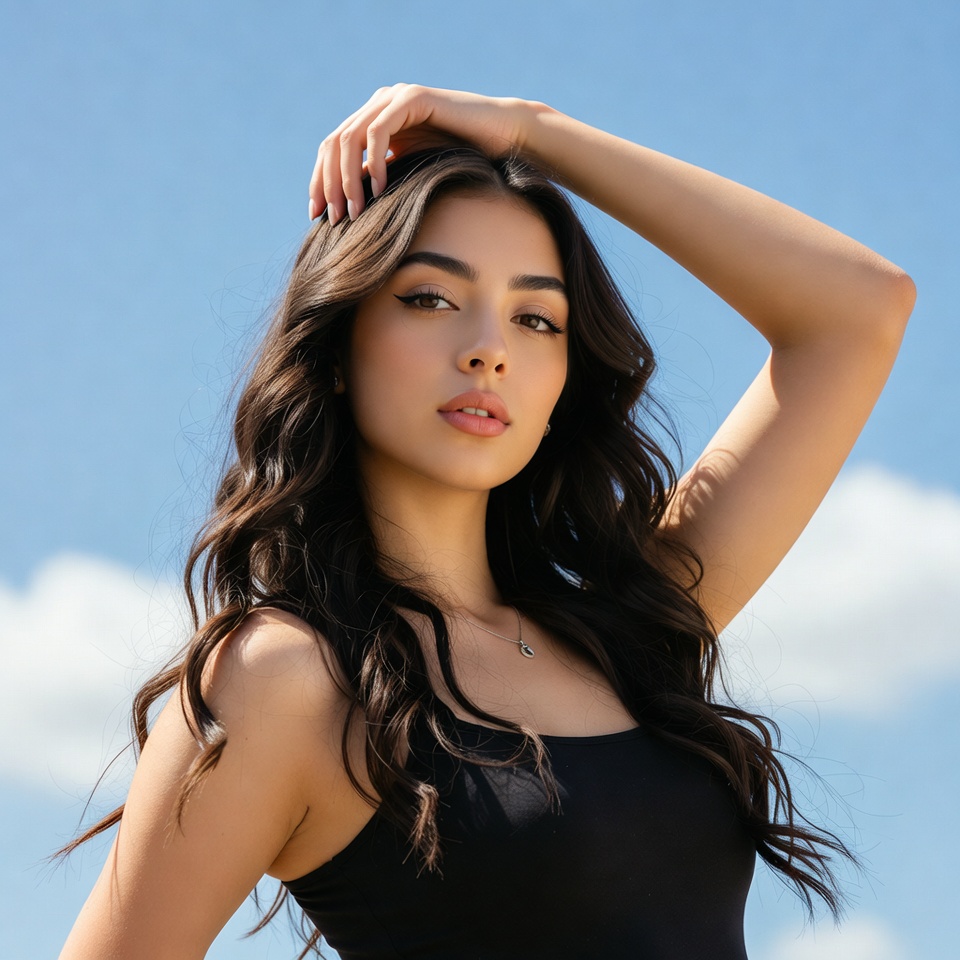 A woman stands outdoors with her hand on her head. She enjoys the sunshine and has long hair. The sky is bright and clear.