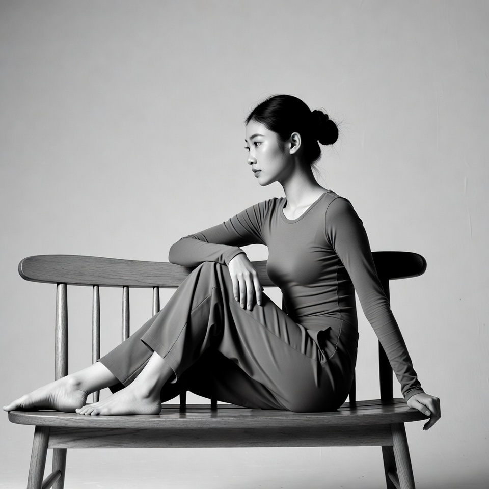 bench, body language, casual, elegance, expression, fashion, female, hairstyle, light, model, monochrome, outfit, pose, posing, side view, simplicity, sitting, studio, tranquility, wood