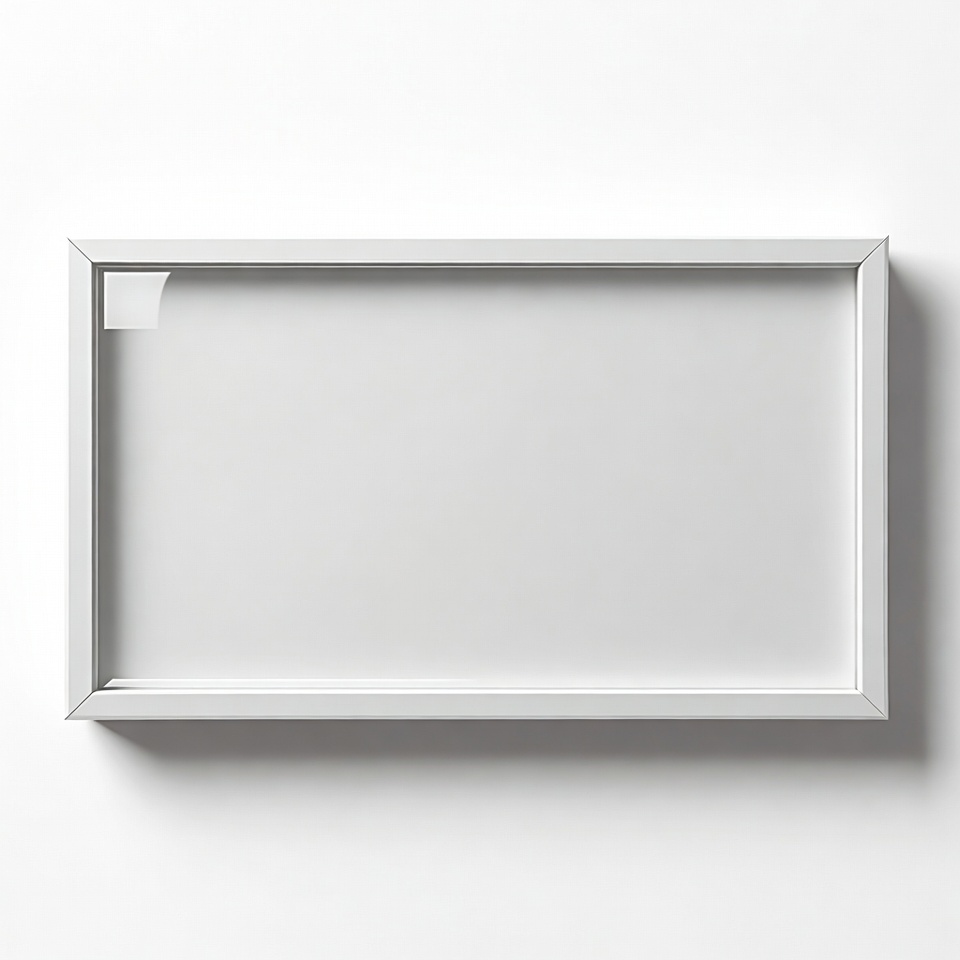 A simple white frame is positioned against a white wall. The frame is currently empty and showcases a clean and modern look.