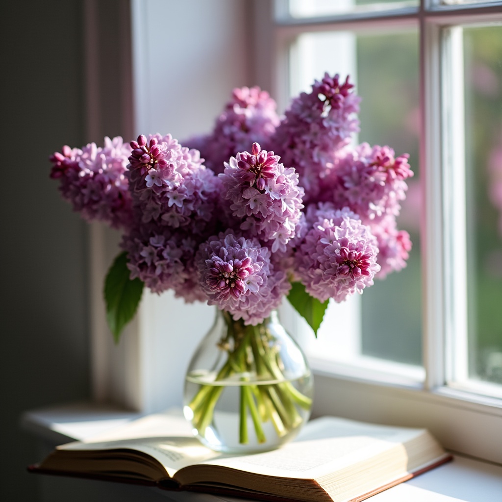 Lilacs are arranged in a clear vase on a window sill with a book beneath them. Sunlight shines through the window, creating a bright setting.