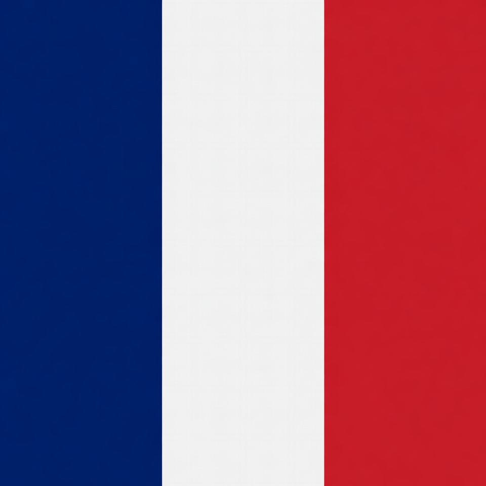 The flag of France shows three vertical bands of blue, white, and red. It represents the country's values and history.