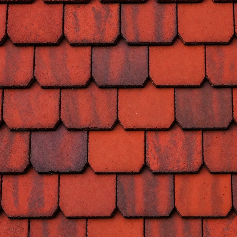 Close view of red roof tiles. The tiles show textures and colors blending. Light reflects off the surface in a pattern.